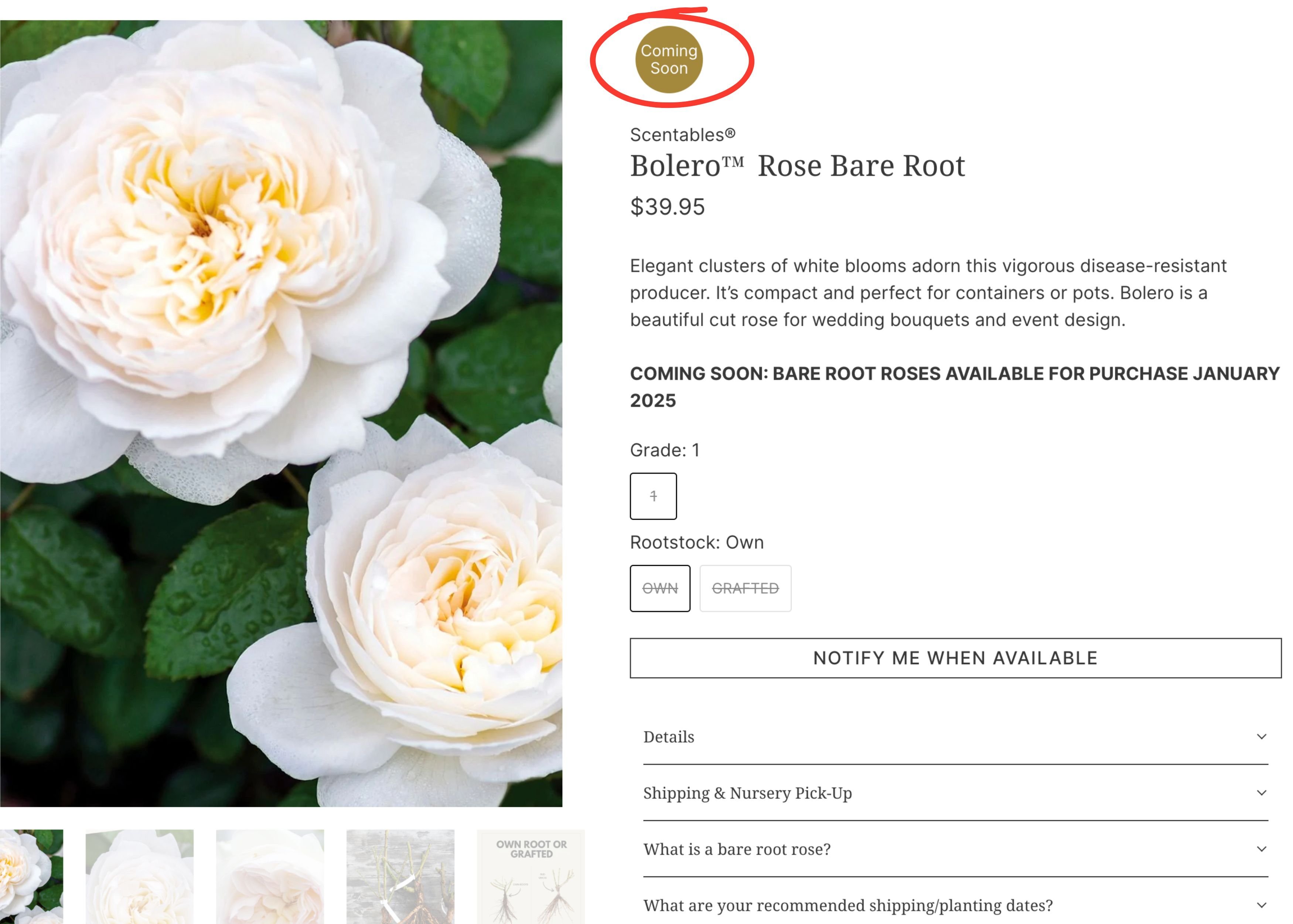 Bare root roses marked "Coming Soon" will be available for purchase in January of 2026. Join our mailing list to get exclusive info about the 2026 collection & find all the answers to your questions regarding bare roots in our Bare Root Rose Help Center!